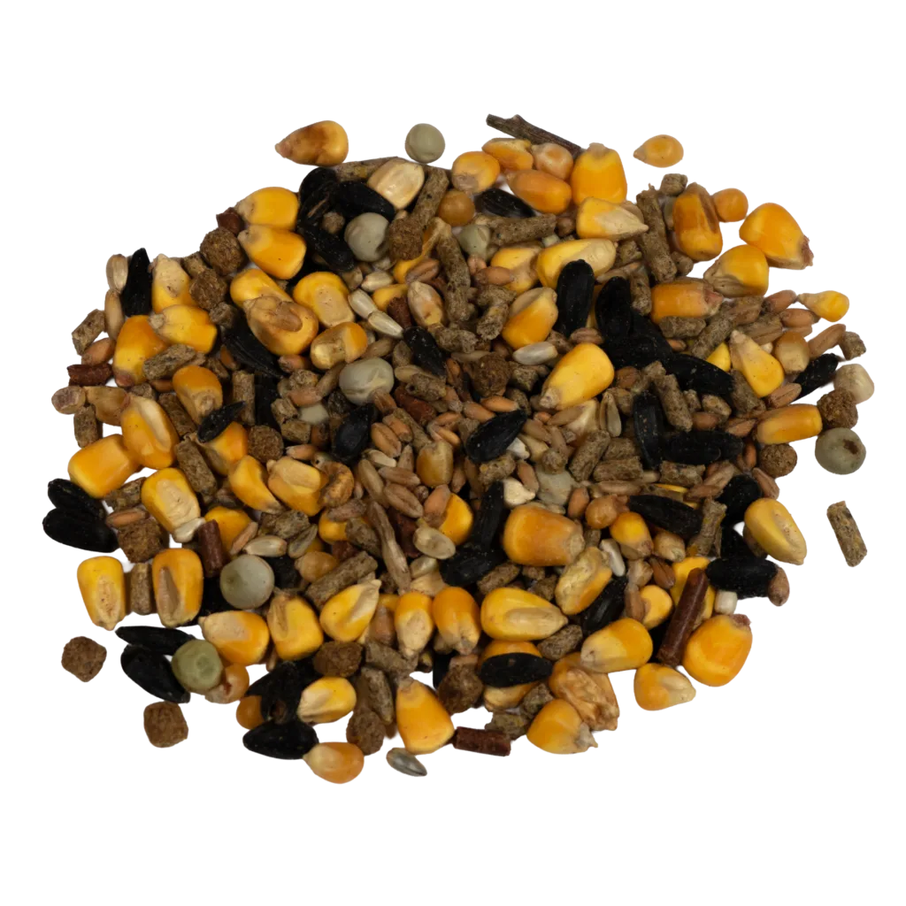 Corn whole, Wheat, Popcorn, Oat Groats, Green Peas, Safflower Seeds, Black Oil Sunflower Seeds, Soybean Meal, Wheat Middlings, Calcium Carbonate, Rice Bran, Alfalfa Meal Dehydrated, Pork Meat and Bone Meal, Soybean Oil, Monocalcium/Dicalcium Phosphate, Salt, DL-Methionine, Dried Citric Acid Presscake, Course Ground Granite Rock, Oyster Shell, Choline Chloride, Ferrous Sulfate, Manganese Hydroxychloride, Manganese Amino Acid Complex, Zinc Hydroxychloride, Zinc Amino Acid Complex, Vitamin E Supplement, Niacin Supplement, Sodium Selenite, Vitamin A Supplement, Basic Copper Chloride, Copper Amino Acid Complex, Dried Bacillus Licheniformis Fermentation Product, Dried Bacillus Subtilis Fermentation Product, Dried Trichoderma Reesei Fermentation Products (Phytase), Sodium Phytate, Riboflavin Supplement, D-Calcium Pantothenate, Folic Acid, Vitamin D3 Supplement, Thiamine Mononitrate, Menadione Dimethylpyrimidinol Bisulfite (source of Vitamin K Activity), Ethylenediamine Dihydroiodide, Pyridoxine Hydrochloride, Biotin, Vitamin B12 Supplement, Dried Whey, Dried Skimmed Milk, Dried Whey Protein Concentrate, Yeast Culture, Zinc Sulfate, Manganese Sulfate, Copper Sulfate, Cobalt Carbonate, Ascorbic Acid, Corn Distiller’s Dried Grains with Solubles, Poultry By-Product Meal, Brewers Dry Yeast, Bentonite, Hydrated Sodium Calcium Alumino Silicates, Calcium Propionate (preservative), Ethoxyquin (preservative), BHA (preservative), Natural & Artificial Flavor Ingredients.